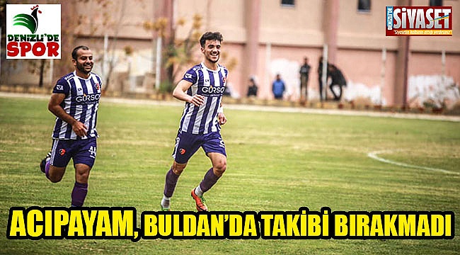 18 Kasım Pazar günü 14.00’da Bulda İlçe sahasında oynanan acıpayam belediye spor – buldan belediyespor karşılaşmasında, Acıpayam Belediye Spor rakibini 6-0’lık faklı bir skorla mağlup etti. Karşılaşma ilk yarıda Raşit İlçebaylık’ın attığı golle 1-0 sona erdi. İkinci yarıda Alican Çelik, Hüsnü Zeybekoğlu, Muhammet Arslan ve Ulaş Yalçın’ın (2) golleriyle Acıpayam Belediye Spor, Buldan Belediyespor’u deplasmanda 6-0 mağlup etti.