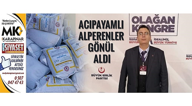 Büyük Birlik Partisi Acıpayam İlçe Başkanı Ramazan Subay ve vakıf yönetiminin birlikte organize ettiği hayır Acıpayamlı ihtiyaç sahiplerine ulaştırıldı. İhtiyaç sahibi iki aileyi tespit eden Acıpayam İlçe Başkanı Ramazan Subay ve İlçedeki genç alperenler bu evin yakıt ihtiyaçlarını karşıladı. Ardından bir hayırseverin Ocak adına adadığı eti ise tespit edilen ihtiyaç sahiplerine dağıttı. “Birlik ve beraberliğe en çok ihtiyaç duyulan zamanda genç Alperen kardeşlerimi bu gayretlerinden dolayı kutluyorum” diyen BBP Acıpayam İlçe Başkanı Ramazan Subay," Birlik ve beraberlik adına her zaman öncü olan zalime karşı Alp mazluma karşı Eren olan Acıpayam'ın öz evlatları şehit lider Muhsin Yazıcıoğlu'nun emanetçilerine yakışan hakkaniyet ile düzenlenen bu kampanya ya yardım eden kıymetli büyüklerimizden Allah razı olsun. Acıpayam'da Alperenler olduğu sürece kimse aç kalmayacak kimse üşümeyecek diyerek bu yola çıktık. Allah yapılan bu hayrı hasenatı kabul etsin. İlçemizin gururu Alperenlerimizi bu gayretlerinden dolayı kutluyorum. İnşallah hep birlikte her yere her alana dokunacağız" dedi.