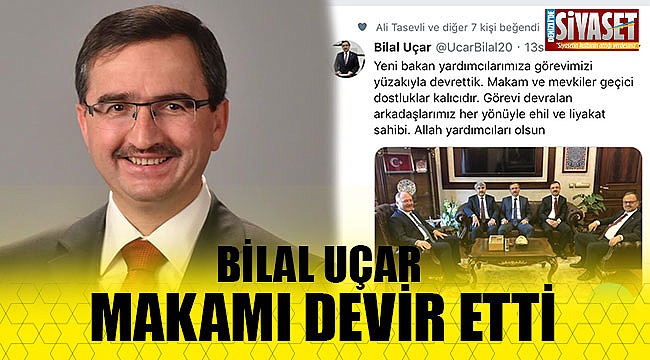 Adalet Bakan Yardımcılığı görevi yeni hükümetin kurulması ile birlikte sona eren Denizli eski milletvekili Bilal Uçar, makamı yeni sahibine devir ederek veda etti. Sosyal paylaşım sitesinden veda mesajı yayımlayan Bilal Uçar, “Adalet Bakan Yardımcılığı görevim yeni hükümetin kurulması ile birlikte sona erdi. Bu görevi bana layık gören sayın cumhurbaşkanımıza ve bakanlarımıza teşekkür ediyorum. Yeni sistemde görev alan bakan yardımcılarımıza da başarılar diliyorum. Yeni bakan yardımcılarımıza görevimizi yüzakıyla devrettik. Makam ve mevkiler geçici dostluklar kalıcıdır. Görevi devralan arkadaşlarımız her yönüyle ehil ve liyakat sahibi. Allah yardımcıları olsun” dedi.