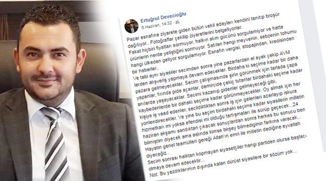 Ertuğrul Devecioğlu, paylaşımında, “Fakat hiçbiri fiyatları sormuyor, halkın alım gücünü sorgulamıyor ve hatta ürünlerin nerde yetiştiğini sormuyor. Satılan hangi meyvenin, sebzenin tohumu hangi ülkeden geliyor sorgulamıyor. Esnafın vergisi, stopajından, kredisinden bir haberler… Ve tabi aynı siyasiler seçimden sonra yine pazarlardan el ayak çekip AVM’lerden alışveriş yapmaya devam edecekler. Bir daha ki seçime kadar bir daha pazara gelmeyecekler. Secim çalışmasında şirin görünmek için tarlada çapa yapanlar, fırında pide açanlar, demircide çekiç tutanlar bir dahaki seçime kadar anılarda yaşayacaklar. Secimi kazanıp gidenler gelmeyeceği gibi, kaybedenlerde bir dahaki seçime kadar görünmeyecekler. Yine bu seçim bir dahaki seçime kadar siyasilerin milletin hizmetkarı mı, yoksa efendisi mi olduğu tartışmaları ile sürüp geçecek. 24 haziran akşamı sandıktan çıkacak sonuçlardan sonra herkes bu sonucu ben bilmiştim diyecek ama aslında kimse bir şey bilmediğinin farkına varacak... Hayatin genel teamülleri gereği Allah'ın emri ile milletin dediğine eyvallah diyeceğiz.. Secim sonrası halktan kopmayan siyasetçiler hangi partiden olursa baş tacı olmaya devam edecektir” ifadelerini kullandı.