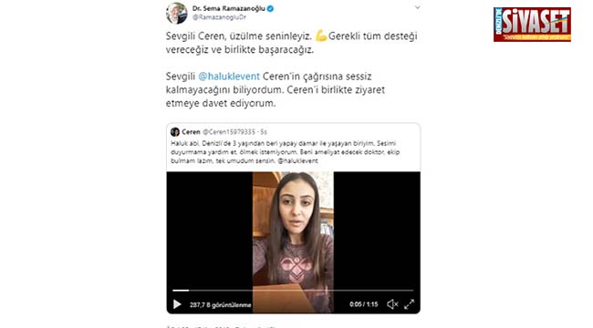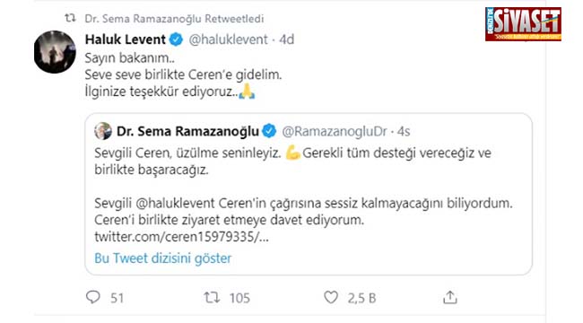 Ceren’in bu talebi, Haluk Levent’ten önce Aile Ve Sosyal Politikalar Eski Bakanı ve eski Denizli Milletvekili Sema Ramazanoğlu’nun dikkatini çekti. Ramazanoğlu, sosyal medya hesabından Haluk Levent’e seslenerek, “Ceren’in birlikte ziyaret edelim” teklifinde bulundu.