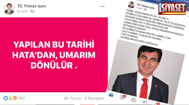 İyi Parti ile chp Genel Başkanları arasında yapılan görüşmeden çıkan sonuç olan Denizli’nin İyi Parti’ye bırakılması, siyaseti oldukça hareketlendirdi. İyi Parti kanadında bayram havası eserken, CHP kanadı ile tam tersine kaynıyor. CHP’den Denizli Büyükşehir Belediye Başkan Adaylığına talip olan ve bir süredir seçim çalışmalarını sürdüren Yılmaz İçen, sitem dolu bir paylaşım yaptı. Akşam saatlerinde yaşanan gelişmenin ardından kendi sosyal medya hesabından “Yapılan bu tarihi hatadan umarım dönülür” paylaşımını yapan İçen’in bu gönderisi çok sayıda beğeni ve yorum aldı. Ardından yeni bir paylaşım yapan İçen, bu kez genel merkezin kararına saygı duyduklarını ve çalışmaya devam edecekleri mesajını verdi. İçen, son paylaşımında, “Genel başkanımızın da talimatı doğrultusunda bu göreve talip olmuştum. Bugüne kadar olduğu gibı bundan sonraki hayatımda da ülkem menfaati ne gerektiriyorsa onu yapacağımdan kimsenin şüphesi olmasın. Bu süreçte bana destek veren tüm dostlarıma teşekkür ederim. İyiki varsınız. Güneş Denizli'den doğacak” dedi.