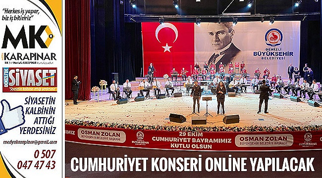 Denizli Büyükşehir Belediyesi, 29 Ekim Cumhuriyet Bayramı kutlamaları kapsamında Denizli Büyükşehir Belediye Konservatuarı’nın hazırladığı online Cumhuriyet Bayramı konseri sunacak. Konser, Büyükşehir Belediyesinin sosyal medya hesapları ile yerel TV’lerden 29 Ekim Perşembe günü akşamı saat 20.00’den itibaren yayınlanacak. Denizli Büyükşehir Belediyesi, 29 Ekim Cumhuriyet Bayramı’nın 97. yılı etkinlikleri kapsamında Denizli Büyükşehir Belediye Konservatuarı’nın hazırladığı online Cumhuriyet Bayramı konserini Denizlililer ile buluşturacak. Online konser programı Büyükşehir Belediyesinin sosyal medya hesaplarından ve yerel TV’lerden 29 Ekim Perşembe günü akşamı saat 20:00’den itibaren yayınlanmaya başlayacak. Programda, Denizli Büyükşehir Belediye Konservatuarı Türk Sanat Müziği, Türk Halk Müziği ve Gençlik Korosu ve Büyükşehir Belediye Bandosu’nun oluşturduğu dev kadro pek çok eser ve marş seslendirecek.
