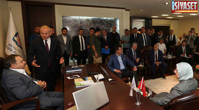 Bir dizi ziyaret ve program için Denizli'ye gelen Orman ve Su İşleri Bakanı Veysel Eroğlu ve Ekonomi Bakanı Nihat Zeybekci, Denizli Büyükşehir Belediye Başkanı Osman Zolan'ı ziyaret etti. Ziyarete, Bakan Eroğlu ve Bakan Zeybekci'nin yanı sıra Denizli Valisi Hasan Karahan, önceki dönem Aile ve Sosyal Politikalar Bakanı ve Denizli Milletvekili Sema Ramazanoğlu ile davetliler katıldı. Başkan Zolan, ziyarette yaptığı konuşmada, Bakan Eroğlu'nu hemşehrileri olarak gördüklerini ifade ederek, Orman ve Su İşleri Bakanlığı olarak hayata geçirdikleri projelerle Denizli'ye çok büyük destek verdiklerini söyledi. Başkan Osman Zolan, şöyle konuştu: ''Başta Sayın Cumhurbaşkanımız ve Başbakanımızın olağan üstü gayretleri, sizlerin Bakanlık anlamında yatırımlarınızla Denizlimiz her geçen gün daha da güzelleşiyor. Şehrimize hoş geldiniz. Bugün temelleri atılan, açılışları yapılan tesisleriyle, göletleriyle, barajlarıyla, parklarıyla Denizli'ye sunduğunuz imkanlardan dolayı ben sizlere çok teşekkür ediyorum. Allah'ım inşallah birlikte güzel hizmetler yapmayı nasip etsin. Bakan Eroğlu:''PARİS NE Kİ DENİZLİ'YE GELİN''Orman ve Su İşleri Bakanı Veysel Eroğlu ise, 15 Temmuz Delikliçınar Şehitler Meydanı'nda yaptıkları temel atma ve toplu açılış töreninden bahsederek, ''Az önce çok muhteşem temel atma ve açılış merasimimizi yaptık. Bunlar içinde en büyük yatırımı Akbaş Barajı, Denizli'ye verilecek su ishale hattı ve modern içme suyu arıtma tesisi. Bu çok önemli bir proje. Hayırlı olmasını diliyoruz dedi. Denizli'nin Ekonomi Bakanı Nihat Zeybekci'nin Belediye Başkanlığı döneminde büyük bir dönüşüm yaşadığını vurgulayan Bakan Eroğlu'nun devamında Osman kardeşim gerçekten bu bayrağı daha da zirveye taşıyarak devam ediyor. Tebrik ediyoruz. Denizlimiz büyüyor ve güzelleşiyor. Artık Denizlimiz marka bir şehirdir. Dünya şehirleri ile yarışıyor. 'Paris ne ki Denizli'ye gelin' diyelim'' şeklinde ifade etti.
