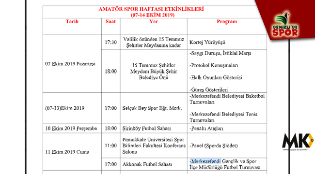 Etkinlikler kapsamında hafta boyunca sportif turnuvalar, bisiklet turu, panel, sağlıklı yaşam yürüyüşü gibi faaliyetler gerçekleşecek. Merkezefendi Belediyesi Selçukbey Spor Tesislerinde Basketbol ve Tenis Turnuvaları, ASKF tarafından Şirinköy Futbol Sahasında penaltı atışları, Akkonak Sahasında Futbol Turnuvası, Teraspark’ta Dart Turnuvası, PAÜ Spor Bilimleri Fakültesinde “Sporda Şiddet” paneli amatör spor haftası boyunca sporseverlerle buluşacak.