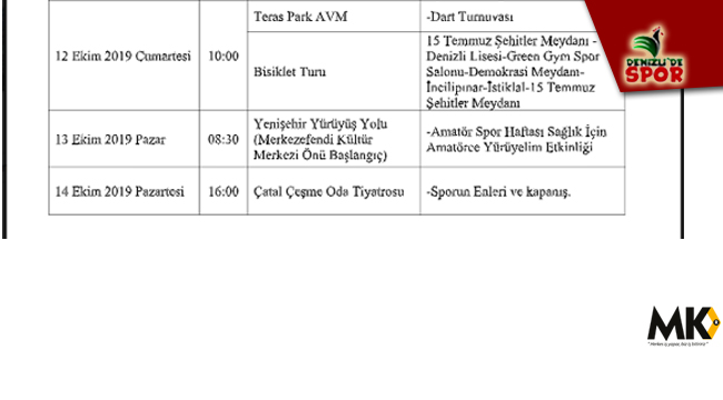 Amatör sporla dolu dolu geçecek haftanın kapanışı 14 Ekim Pazartesi günü saat 16.00’da Çatalçeşme Oda Tiyatrosunda olacak. Programda 2019 yılında Denizli’de spora damga vuran isimler, milli sporcular ve yıl boyunca ulusal ve uluslararası organizasyonlarda ilimizi ve ülkemizi başarıyla temsil etmiş sporcular halka tanıtılarak “Sporun En’leri” ödül töreni yapılacak. Ayrıca hafta boyunca yapılan turnuvalarda dereceye giren sporculara ödülleri verilecek.