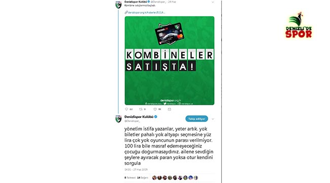 Süper Lig'e yükselen Denizlispor'un kombine ücretlerini paylaştığı fotoğrafın altına gelen eleştirilere kulüpten sert tepki geldi. Taraftarların altyapı seçmeleri için istenen fiyatı eleştirmesine, "Yönetim istifa yazanlar, yeter artık. Yok biletler pahalı, yok altyapı seçmesine 100 lira çok, yok oyuncunun parası verilmiyor. 100 lira bile masraf edemeyeceğiniz çocuğu doğurmasaydınız. Ailen, sevdiğin şeylere harcayacak paran yoksa otur kendini sorgula" şeklinde yanıt verildi.
