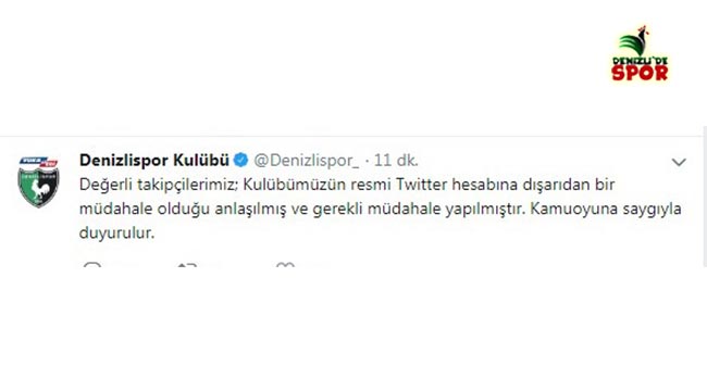 Açıklama da " Değerli takipçilerimiz; Kulübümüzün resmi Twitter hesabına dışarıdan bir müdahale olduğu anlaşılmış ve gerekli müdahale yapılmıştır. Kamuoyuna saygıyla duyurulur." ifadeleri yer aldı.