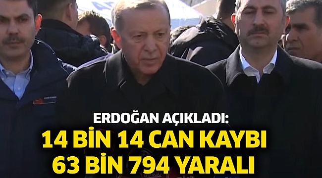 Cumhurbaşkanı Recep Tayyip Erdoğan, deprem bölgesine gitti. Deprem acısının yaşandığı 10 ilden biri olan Gaziantep’te de incelemelerde bulunan Erdoğan, basın açıklaması yaptı. Erdoğan, alınan son rakamlara göre 14 bin 14 vatandaşın yaşamını yitirdiğini, 63 bin 794 yaralı olduğunu söyledi. 10 ilde 6 bin 444 bina yıkıldığını da aktardı.
