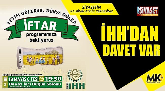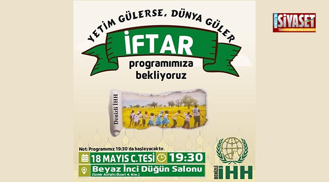 Denizli İhh şube başkanı Hasan Ali Solak ,11 ayın sultanı mübarek Ramazan Ayı dolayısıyla 18 Mayıs Cumartesi günü Beyaz İnci Düğün Salonunda (İzmir Asfaltı Üzeri 4. Km.) verecekleri iftar sofrasına tüm Denizlilileri davet etti. ‘Yetim gülerse dünya güler’ sloganıyla yola çıkan Denizli İHH’nın şube başkanı Solak, “Kuracağımız büyük iftar sofrasıyla barışı, eşitliği, kardeşliği, dostluğu pekiştirerek birlik ve beraberliği kucaklayacağız. Güzel bir Ramazan akşamında birlikte olmak dileğiyle tüm hemşerimizi 18 Mayıs Cumartesi akşamı düzenleyeceğimiz iftar yemeğimize davet ediyorum. Bu manidar yemeğin gerçekleşmesinde katkısı olan tüm hayırsever kardeşlerimize teşekkür ediyoruz. Allah onlardan razı olsun” dedi.