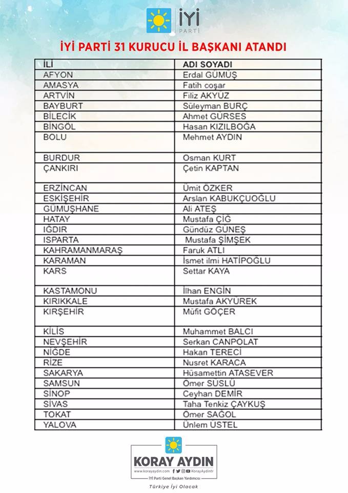 Meral Akşener öncülüğünde kurulan İyi Parti'nin 31 il başkanı açıklandı. Denizli'nin ise 15 Kasım'da açıklanacağı öğrenildi.