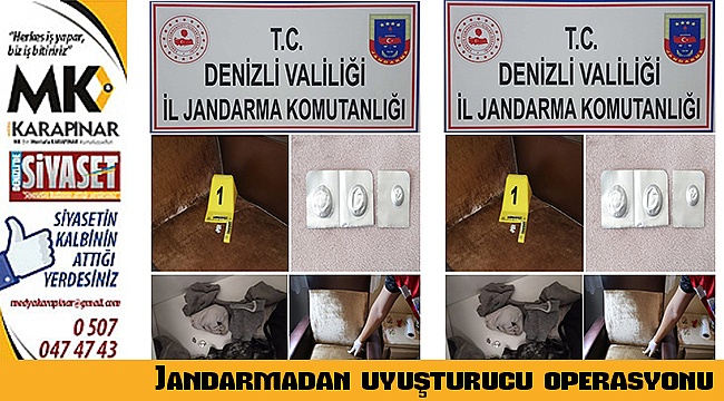 Halk arasında torbacı olarak adlandırılan uyuşturucu satıcılarını, uzun zamandır takibe alan Denizli İl Jandarma Komutanlığınca Acıpayam, Merkezefendi VE Pamukkale İlçelerinde, 14 Temmuz 2020 tarihinde 22 adrese eş zamanlı operasyon gerçekleştirildi. Operasyonda 20 şüpheli yakalandı. Yapılan aramalarda ise; (149) gram eroin, (3) gram metamfetamin,(7) adet extacy uyuşturucu hap, (15) gram kubar esrar, (3) adet 7,65 mm tabanca fişeği, (1) adet kurusıkı tabanca ele geçirildi. Ele geçirilen uyuşturucu ve malzemelere el konuldu. Adli işlemleri devam eden (20) şüpheli gözaltına alındı.