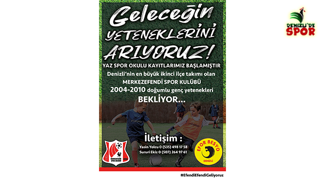 Gençlerin yaz tatillerini dolu bir programla geçirip eğlenirken öğrenmesi gerektiğini söyleyen Merkezefendispor Kulübü Başkanı Mustafa Karapınar, “ Biz her zaman yeni nesillerin destekçisiyiz. Gençlerimiz için var gücümüzle çalışmalarımıza devam ediyoruz. Kendimize şiar edindiğimiz “Gelecek gençlerimiz, gençlerimiz geleceğimiz” sloganına uygunluk ilkesinde açmış olduğumuz Yaz Spor Okulu futbol branşına tüm genç arkadaşlarımız hem öğrenecek hem de eğlenecek. Gazi Mustafa Kemal Atatürk’ün de dediği gibi “Sağlam kafa sağlam vücutta bulunur” sağlam vücudun temellerini atmak için tüm gençlerimizi bekliyoruz.Yaz spor okuluna kayıt yaptırmak isteyen gençlerimiz, 0 535 498 17 58 (Yasin Yolcu), 0 507 264 97 61 (Sururi Ekiz) numaralardan bizlere ulaşabilirler” dedi.