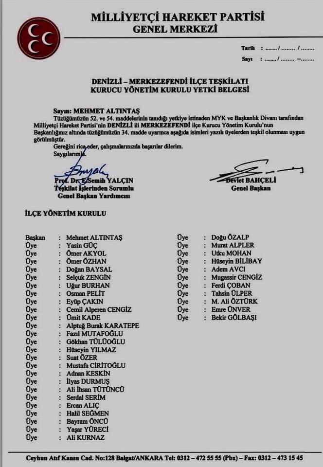 Av. Mehmet Altıntaş, mhp il yönetiminin dün akşamki toplantısına ilk kez MHP Merkezefendi ilçe Başkanı olarak katıldı. Mehmet Altıntaş’ın Merkezefendi İlçe Başkanı olmasının ardından oluşturmuş olduğu yeni MHP Merkezefendi İlçe Teşkilatı Yönetim Kurulu listesi , MHP Genel Başkanı Dr. Devlet Bahçeli ve Teşkilat İşlerinden Sorumlu Genel Başkan Yardımcısı Prof. Dr. Semih Yalçın tarafından onaylandı.