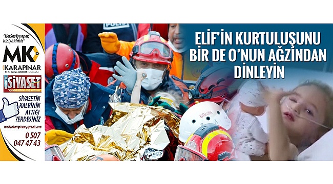 Eşini enkazdan ölü çıkarmış ama gözü enkazda sanki Elif’in sesini duyuyormuş gibi bizi motive etmeye çalışıyor, sizlerden Allah razı olsun siz ban Elif’i canlı çıkaracaksınız. Son noktaya geldik dikkatli olalım gibi söylemlerde bulunuyordu. O’nun kararlı tutumu hepimizi motive etmişti. 3. Gün, gün ağarırken dairenin son odası Elif’in odası idi. İtinalı çalışma ve azmin kararlılığın sonucu Elif bebek göçük altından çıkartıldı. Elif bebek çok şükür ki, yaşıyordu. Hepimizin gözleri doldu. Alkışlar arasında gözyaşlarımız sel olup aktı. Rabbim kim ki bu çalışmalara en ufak bir katkı sağladı ise, sadece sahada enkaz kaldırarak değil su, çorba, simit dağıtanlar da dahil hepsinden binlerce razı olsun. Güzel ülkem Türkiye... Başka Türkiye yok…” dedi.