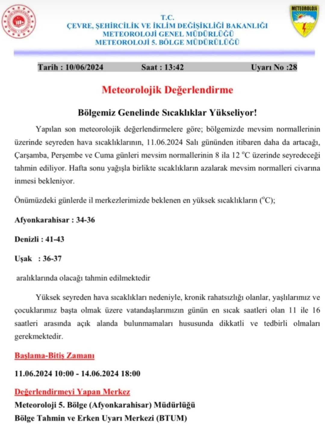 Denizli, geçtiğimiz hafta sıcak havanın etkisi altına girmişti. Denizli Meteoroloji Müdürlüğü’nden edinilen bilgiye göre; hava sıcaklıkları 8 ile 12 derece artacak. Bugün saat 10.00’da başlayan ve 16 Haziran Cuma gününe saat 18.00’a kadar devam etmesi beklenen sıcaklıklara karşılık uzmanlar kronik rahatsızlığı olanlar, yaşlılar ve çocuklar başta olmak üzere vatandaşların günün en sıcak saatleri olan 11 ile 16 saatler arasında açık alanda bulunmamaları hususunda dikkatli ve tedbirli olmaları gerektiğini söyledi. Hava sıcaklıklarının önümüzdeki hafta başlaması beklenen yağışlarla birlikte düşeceği belirtildi.