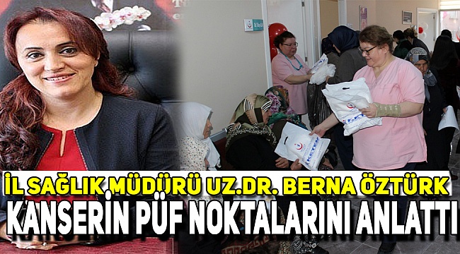 Kanserde erken teşhisin önemine dikkat çeken Uz. Dr. Berna Öztürk “Kanser, özellikle erken teşhis edildiğinde, tedavisi mümkündür. Halk Sağlığı Genel Müdürlüğü tarafından yürütülen tarama programları ile meme, rahim ağzı ve kalın barsak kanseri erken teşhis edilebilmektedir. İlimizde kanser konusunda Kanser Erken Teşhis, Tarama ve Eğitim Merkezi (KETEM), Toplum Sağlığı Merkezleri ve Aile Hekimliklerinde kanser taramaları ücretsiz yapılmaktadır. Bu tarama programı kapsamında; 40 yaş üzerindeki her kadın 69 yaşına kadar 2 yılda bir mamografi çektirerek meme kanseri taraması yaptırmalı, 30 yaşını dolduran her kadın 65 yaşına kadar 5 yılda bir rahim ağzı kanseri taramasına yönelik HPV/smear testi ile yaptırmalı, 50 yaşını dolduran kadın erkek her vatandaşımız da 70 yaşına kadar kalın barsak kanseri taraması kapsamında 2 yılda bir gaitada gizli kan testi yaptırmalıdır. Vatandaşlarımızı taramalarını ücretsiz yaptırmak üzere KETEM ve Aile Sağlığı Merkezlerine bekliyoruz” dedi.