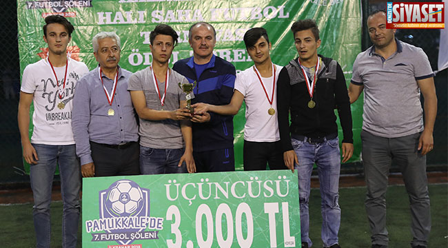 “Pamukkale’de 7. Futbol Şöleni İlkbahar 2018 Halı Saha Futbol Turnuvası”nın final maçının ardından ödüller düzenlenen törenle verildi. Üçüncü olan Karşıyaka Gençlergücü’nün kupa, madalya ve 3000 TL’lik hediye çekini Gençlik Hizmetleri Spor Pamukkale İlçe Müdürü Zafer Akçay verdi. İkinci olan İstiklal Dost İstiklalgücü’nün 4000 TL’lik hediye çeki ve ödüllerini ise Pamukkale Belediye Başkan Yardımcıları Türkay Gözlükaya ve Abdullah Sevinçli tarafından verildi. Müsabakalarda görev yapan hakemlerin bağlı bulunduğu Türkiye Faal Futbol Hakemleri ve Gözlemcileri Derneği Denizli Şubesi’nin plaketini maçı da yöneten Denizli’nin FİFA kokartlı hakemi Sedef Aktan’a Pamukkale Belediye Başkanı Hüseyin Gürlesin verdi. Başkan Gürlesin, turnuvada attığı 13 golle gol kralı unvanını alan Zümrüt Zeytinköy Zümrütspor’dan Hakan Şahin’e gol krallığı kupasını verdi. Müsabakalarda sağlıkçı olarak görev yapan Serkan Güleçyüz de Başkan Gürlesin tarafından teşekkür plaketi alan isimlerden oldu.