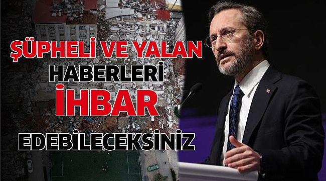 Türkiye Cumhuriyeti İletişim Başkanı Fahrettin Altun sosyal medyada açıklamada bulundu. Altun, “Vatandaşlarımızın sosyal medya başta olmak üzere çeşitli mecralarda paylaşılan asılsız bilgilere itibar etmemeleri, doğru bilgi için resmî kaynakları takip etmeleri büyük önem arz etmektedir. Devletimiz tüm gücüyle depremden etkilenen bölgelerde çalışmalarını sürdürmektedir. Ayrıca ''Dezenformasyon Bildirim Servisi'' halkımızın kullanımına açılmıştır. deprem felaketine ilişkin üretilen ve yayılan şüpheli/yalan olduğunu düşündüğünüz haberleri uygulamamızı telefonunuza indirip bildirebilirsiniz.” dedi.